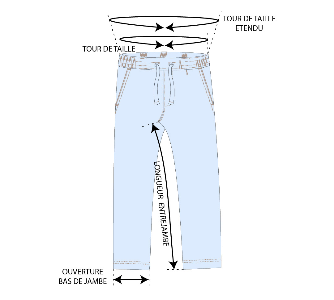 | Ouverture bas de jambe (cm) | 19 | 20 | 21 | 22 | 23,5 | 25 | 26,5 | 28 |