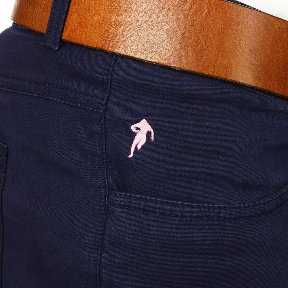 Pantalon rugby Ruckfield bleu marine avec l'intérieur de la ceinture fleuri et la silhouette de Sébastien Chabal brodée sur le côté droit.