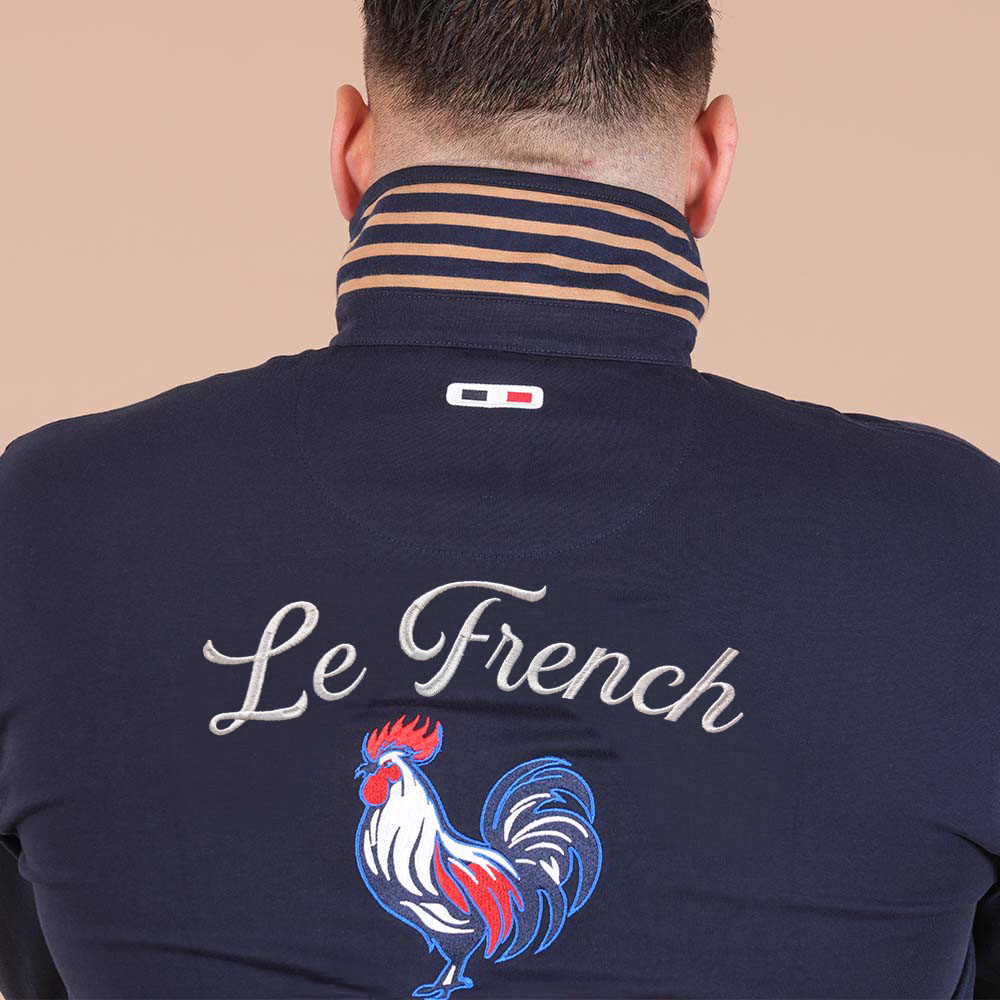 Son design se distingue par une superbe broderie au dos représentant un coq, symbole fort de l’identité française, apportant caractère et originalité à la pièce. Les manches longues sont sublimées par un liseré tricolore bleu, blanc, rouge en finition, rappelant avec subtilité les couleurs nationales.