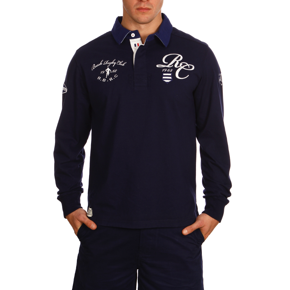 Polo rugby manches longues marine, 100% coton. Broderie poitrine et manches. Demi-lune beige et propreté intérieur col contrastée ciel. Disponible en grande taille (jusqu'au 5XL)