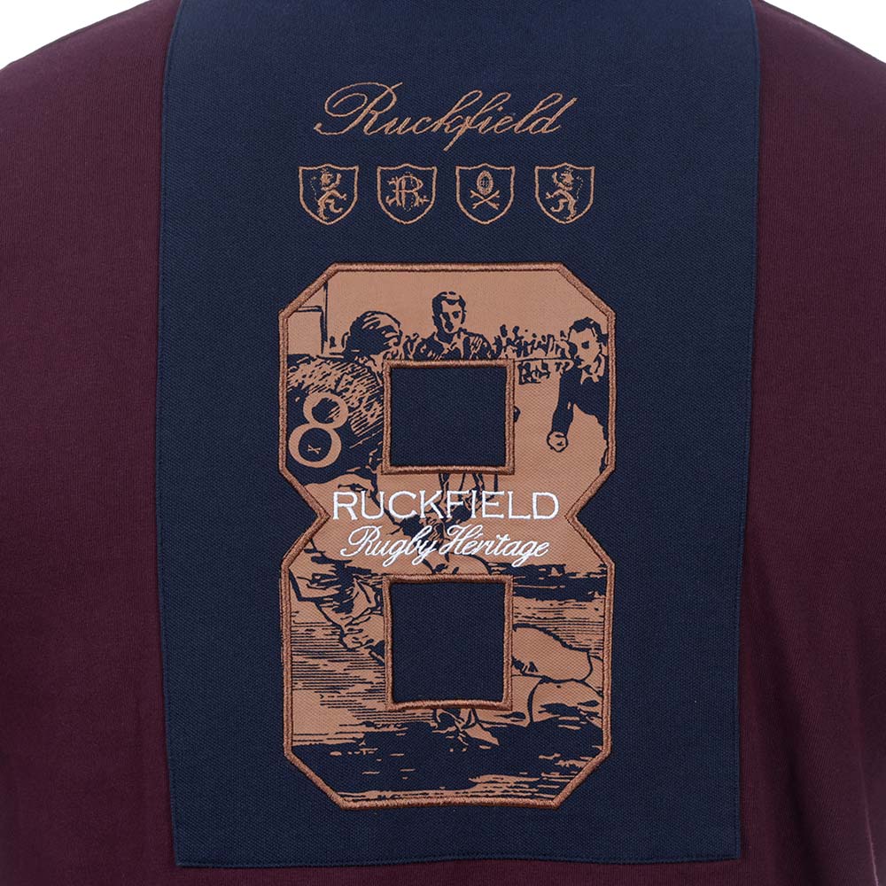 L'arrière du dos est orné d'un magnifique 8 brodé avec des sérigraphies vintages de rugby à l'intérieur du numéro.