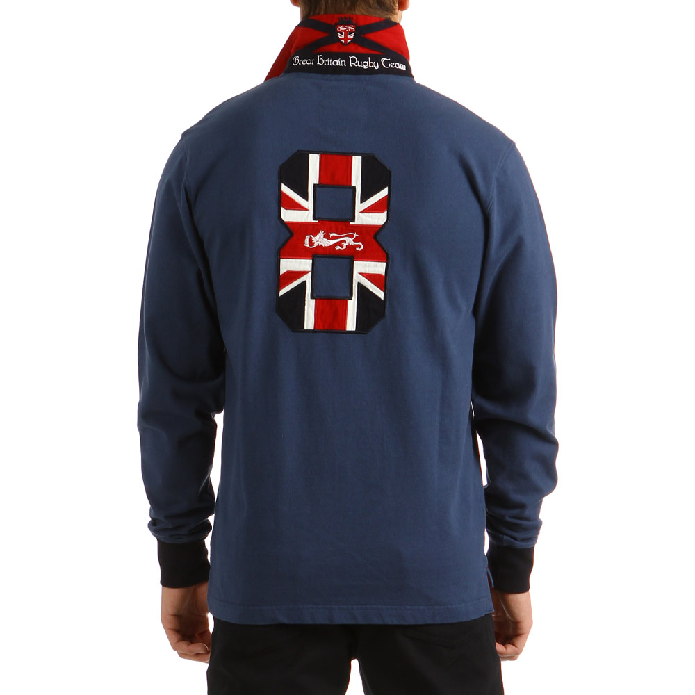 Ce polo rugby bleu, 100% coton, se distingue par sa broderie du numéro 8 au dos, aux couleurs du Royaume-Uni. L'écusson du pays est brodé à l'intérieur du col. Ce modèle est disponible en grande taille jusqu'au 4XL.