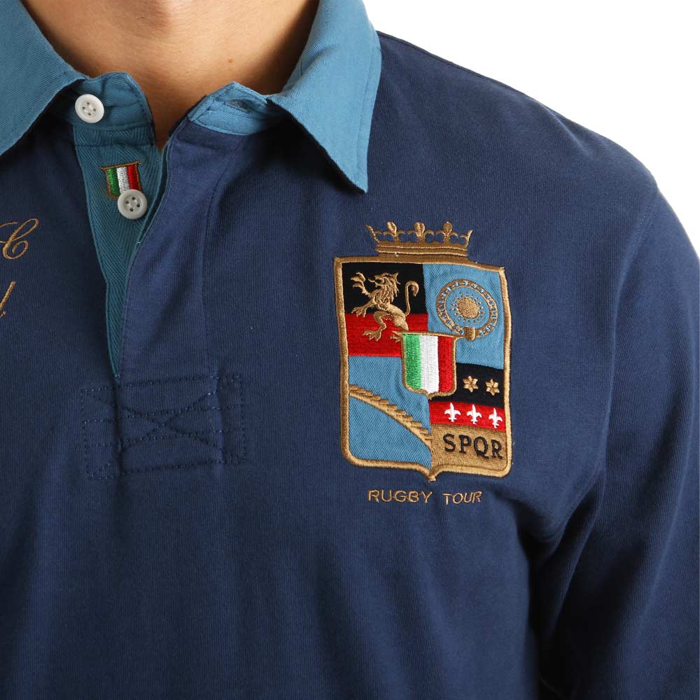 Ce polo bleu s'inspire de Mauro Bergamasco, figure emblématique du rugby italien, avec ses broderies poitrine, intérieur du col et dos. Ses coudières lui confèrent un style plus sportswear.