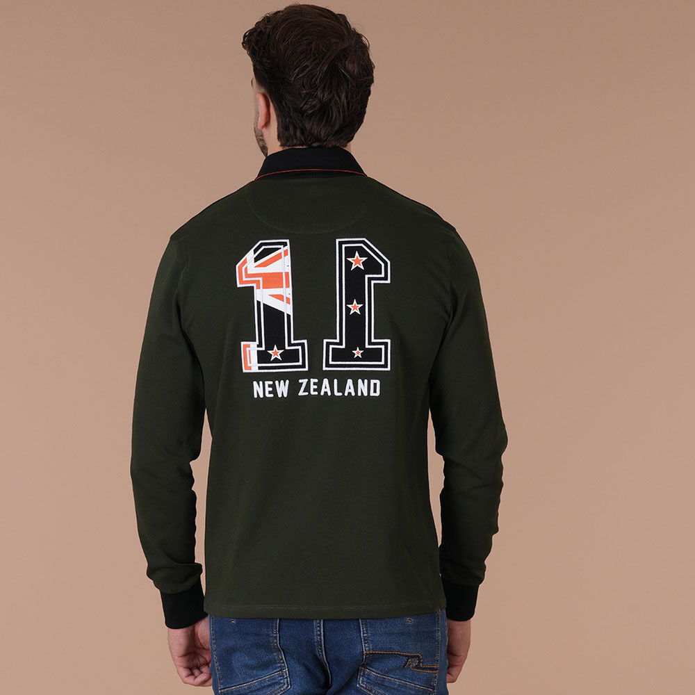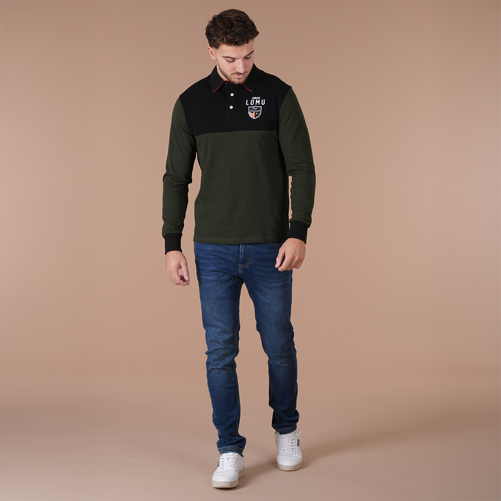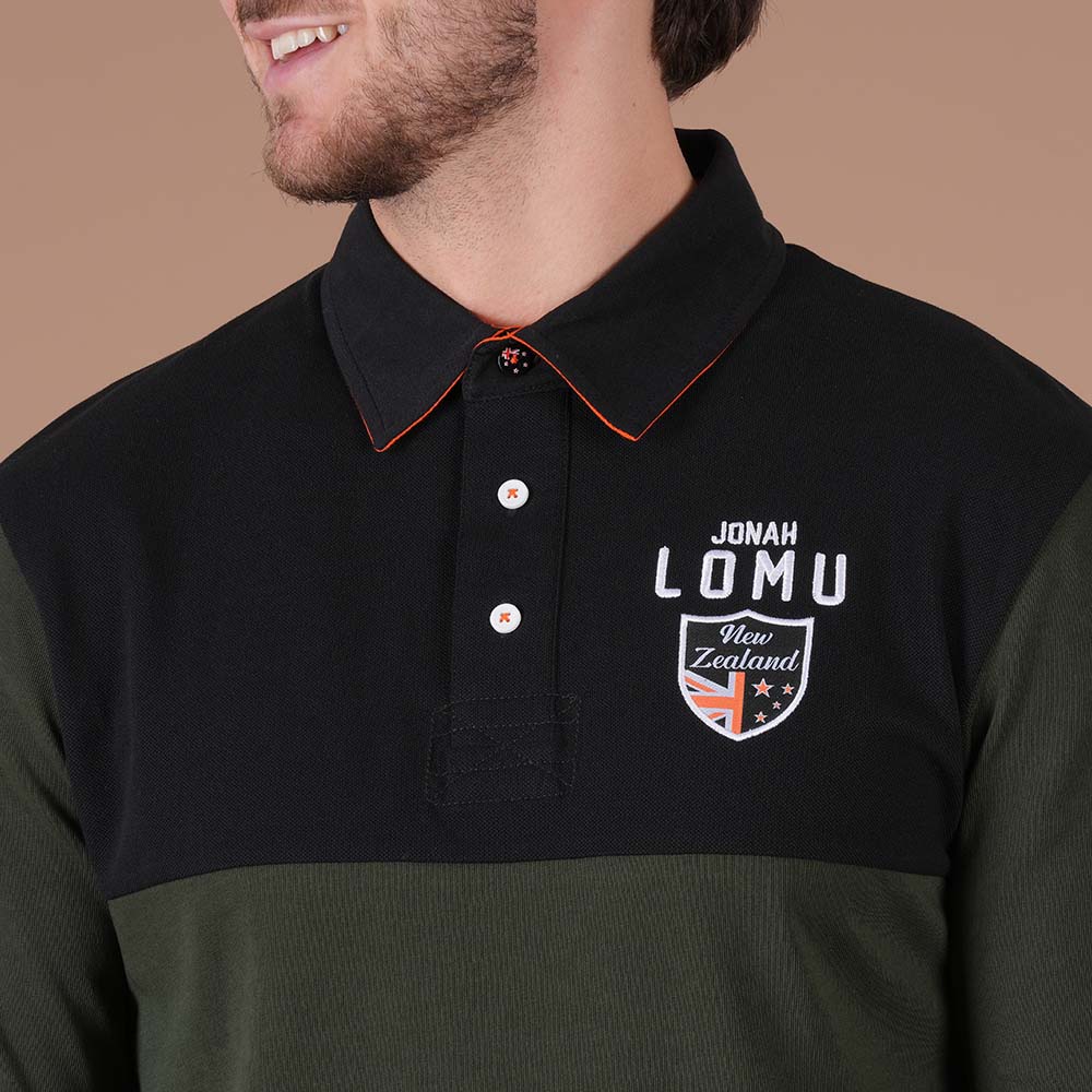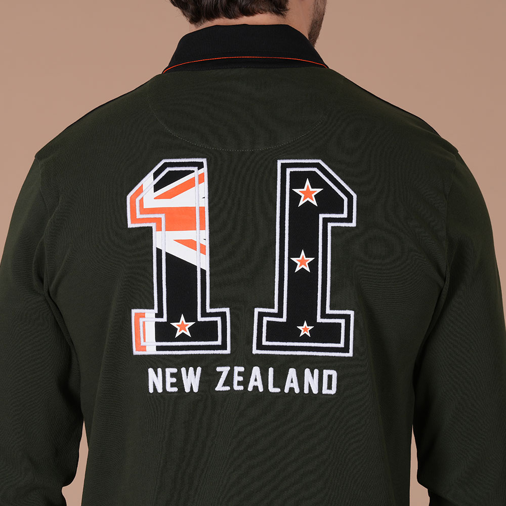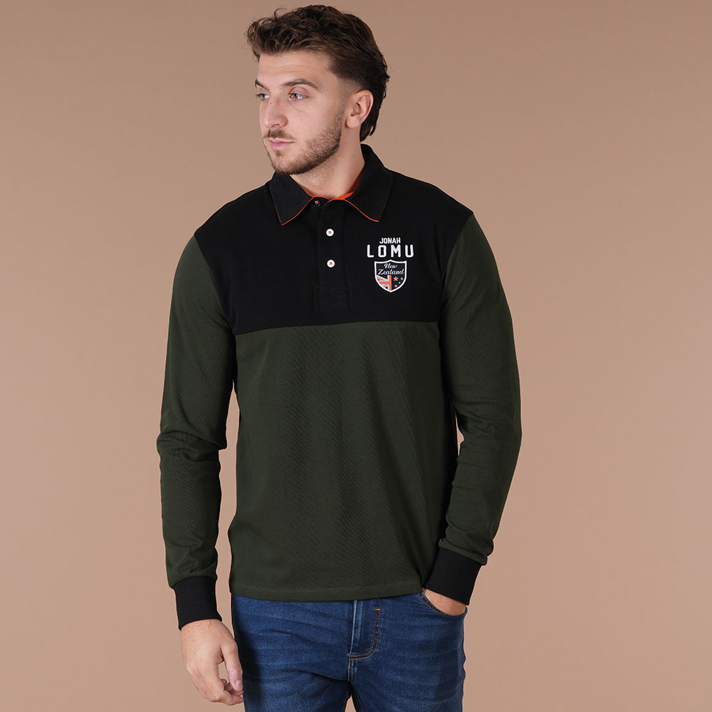 Un polo qui ne fait pas dans la discrétion. Avec son colorblock noir/kaki et ses détails contrastés, il s’inscrit clairement dans l’univers rugby. À l’avant, un patch poitrine sobre structure la pièce. Mais c’est surtout au dos que le modèle s’exprime : un grand “11” graphique accompagné de “New Zealand”, clin d’œil direct à l’héritage de Jonah Lomu. Le col polo avec liseré contrasté et la patte de boutonnage apportent une touche soignée, tandis que la matière confortable et les poignets resserrés assurent une tenue nette au quotidien.