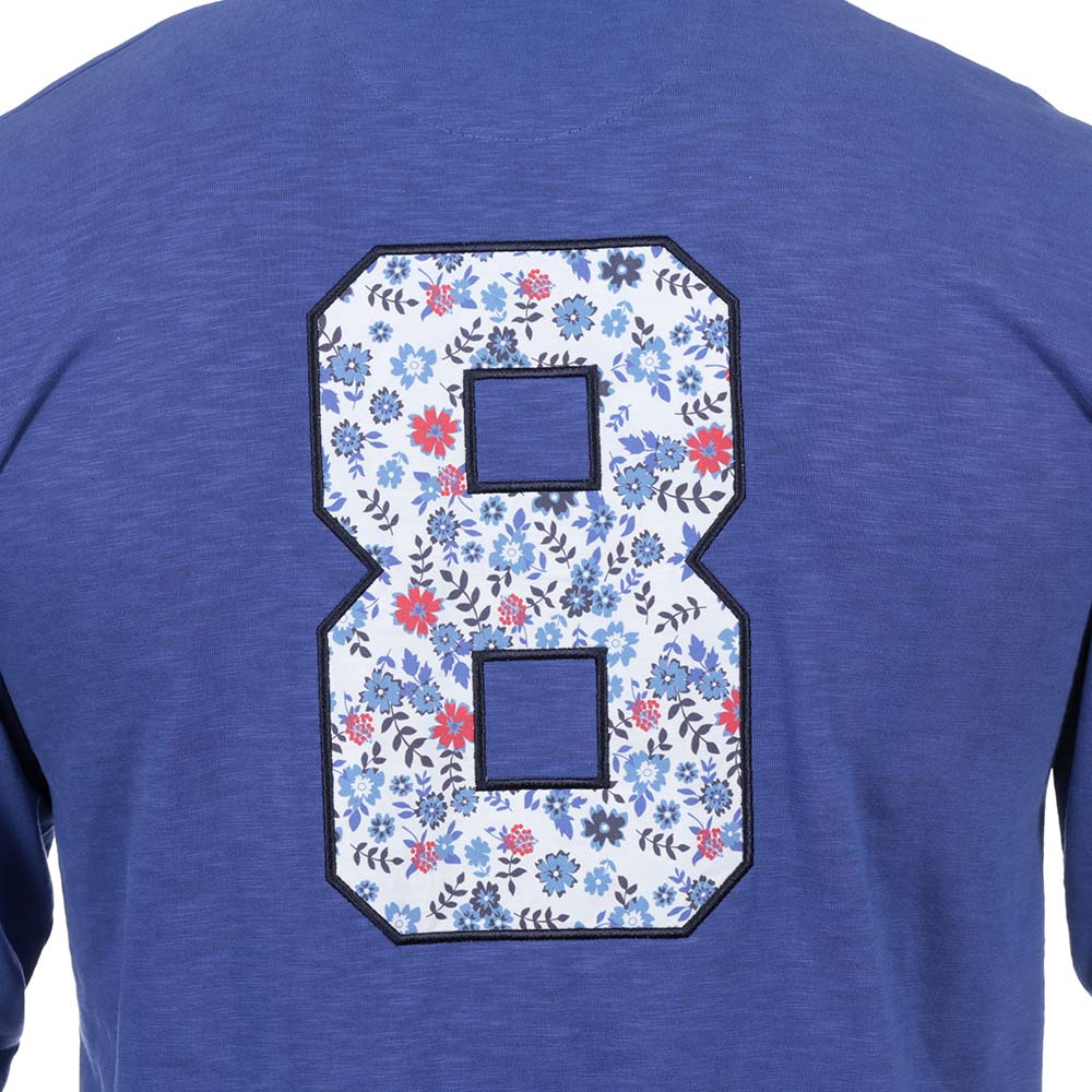 Le revers de col, la poche, la patte de boutonnage et le numéro 8 dans le dos sont contrastés avec des imprimés fleuris, pour des détails supplémentaires.