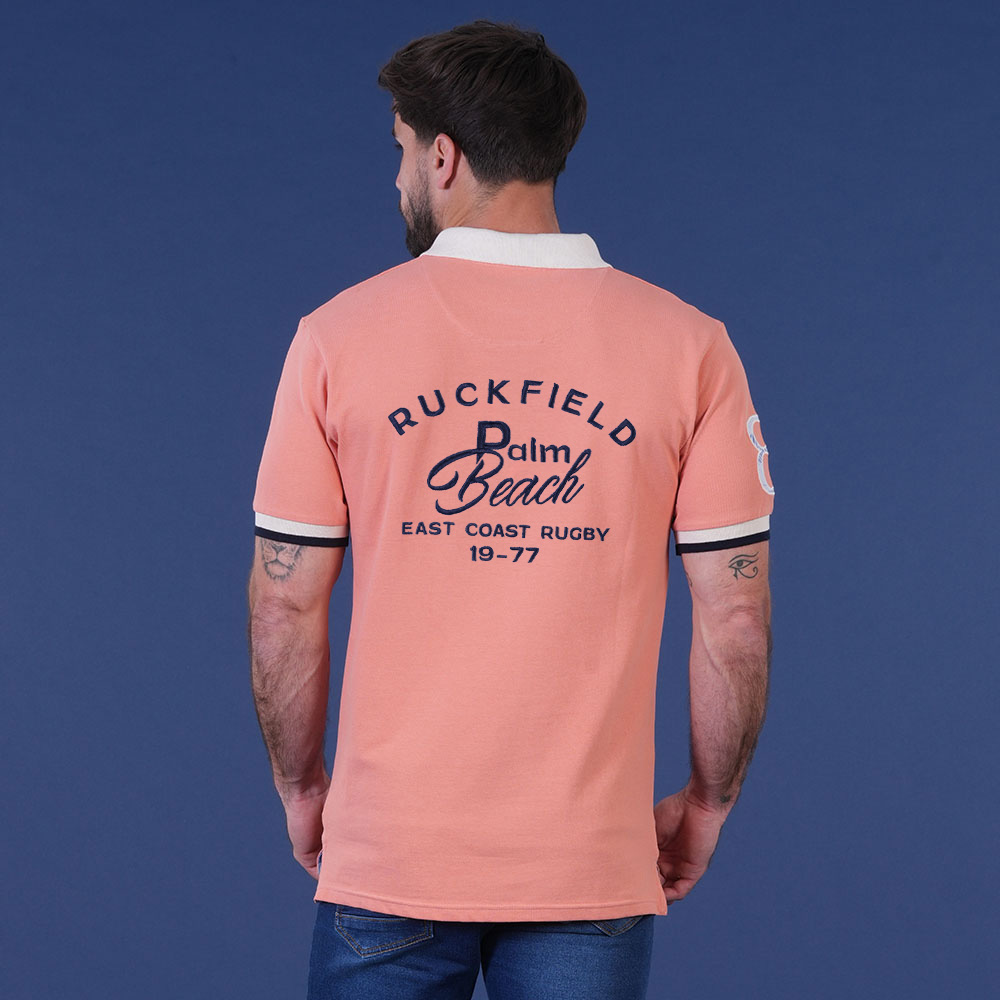 Affichez un style sportif et élégant avec ce polo Ruckfield Palm Beach, inspiré de l’univers du rugby et des plages de la côte Est. Confectionné dans une maille piquée en coton doux, il offre un confort optimal et une coupe classique. Le coloris rose pêche est rehaussé d’un col et de bords de manches contrastés en blanc et marine. Au dos, une large broderie "Ruckfield Palm Beach East Coast Rugby 19-77" apporte une touche vintage et authentique. Une broderie discrète sur la manche complète le look.