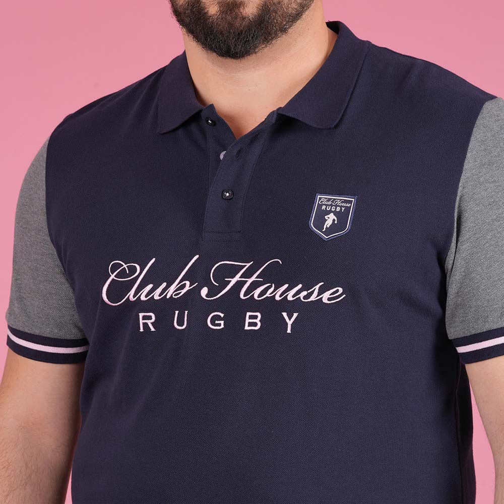 Alliez style et confort avec ce polo à l’allure sportive et élégante. Conçu dans une coupe droite, il se distingue par ses manches contrastées gris chiné avec finitions à bandes, son col classique à trois boutons et son inscription brodée Club House Rugby sur la poitrine. Le patch brodé côté cœur apporte une touche authentique et raffinée.