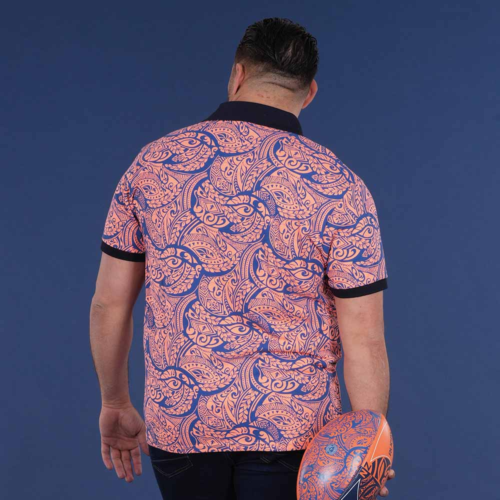 Apportez une touche d’élégance sportive à votre vestiaire avec ce polo Ruckfield. Il se distingue par son motif all-over bleu sur fond orange vif évoquant l’art et la culture maorie. Son col contrasté noir avec l’intérieur bleu ajoute une note moderne et raffinée, tandis que le logo brodé sur la poitrine rappelle l’identité de la marque.
