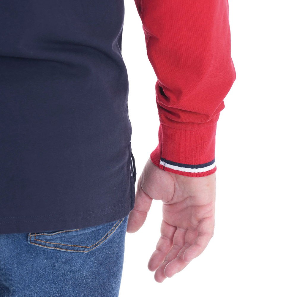 Affirmez votre style avec ce polo à manches longues au design audacieux et sportif. Son coloris bleu marine, contrasté par une manche rouge dynamique, lui confère une allure unique et affirmée.