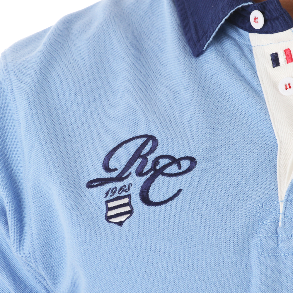 Polo rugby manches courtes ciel, 100% coton. Broderies poitrine. Rib contrasté blanc et marine en bas de manches.
