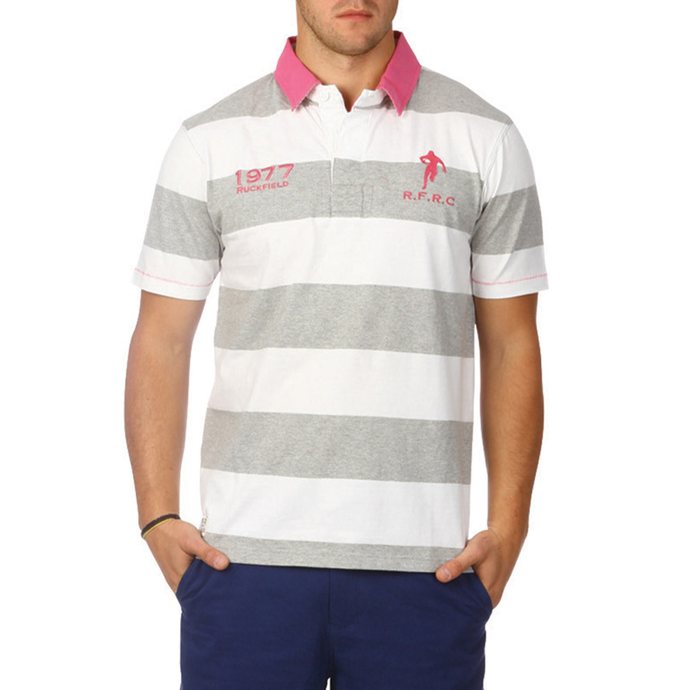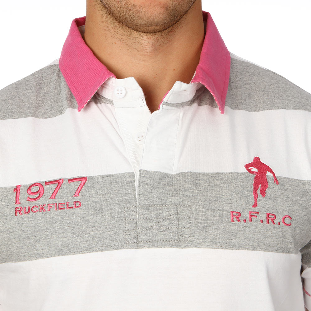 Polo rugby Ruckfield gris chiné rayé blanc avec finitions et broderies en rose . L'intérieur du col et l'interieur du polo sont en vichy rose. Ce produit est disponible en grandes tailles jusqu'au 4XL.