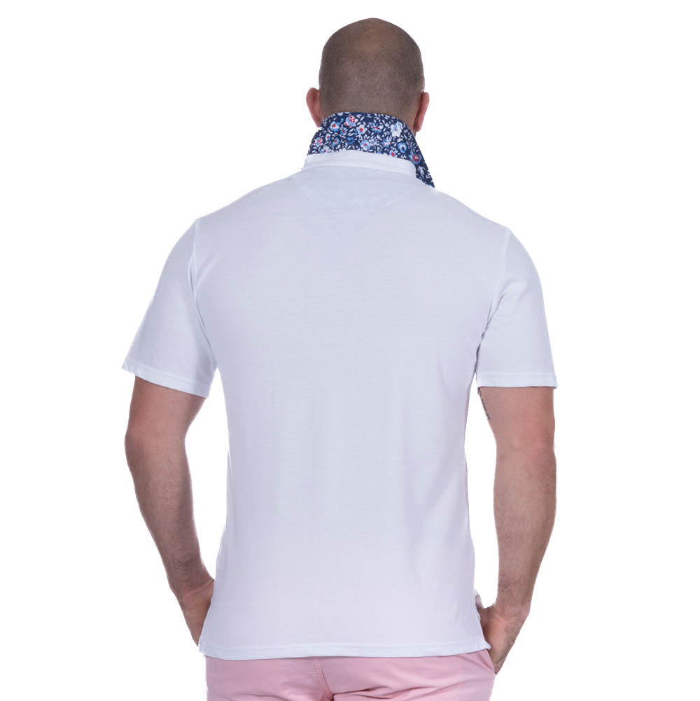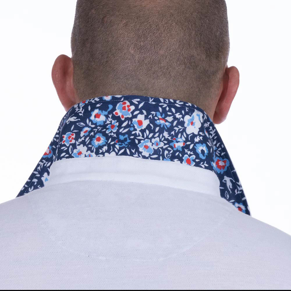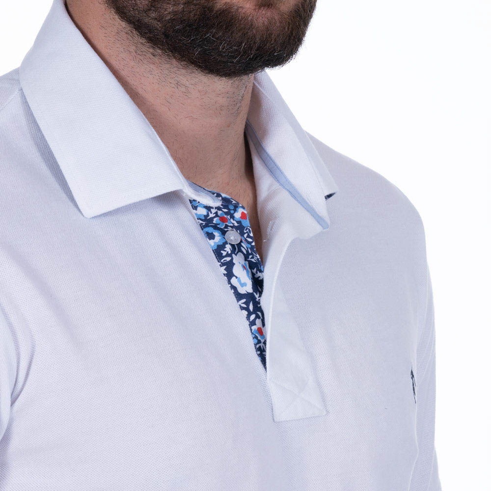 Le revers de col et la patte de boutonnage en tissu fleuri apportent un plus à ce polo uni.