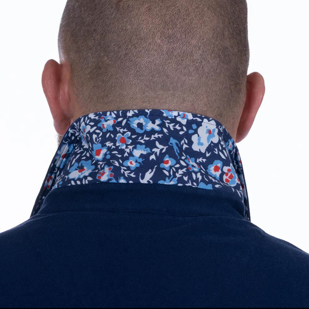 Le revers de col et la patte de boutonnage en tissu fleuri apportent un plus à ce polo uni.