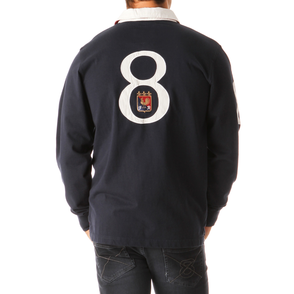 Le polo Rugby France manches longues en jersey et 100% coton se distingue par ses écussons brodés sur la poitrine gauche et droite, ainsi que le numéro 8 de Sébastien Chabal au dos. L'association du marine, du col blanc et du revers de col rouge mettent en avant les couleurs du drapeau tricolore.