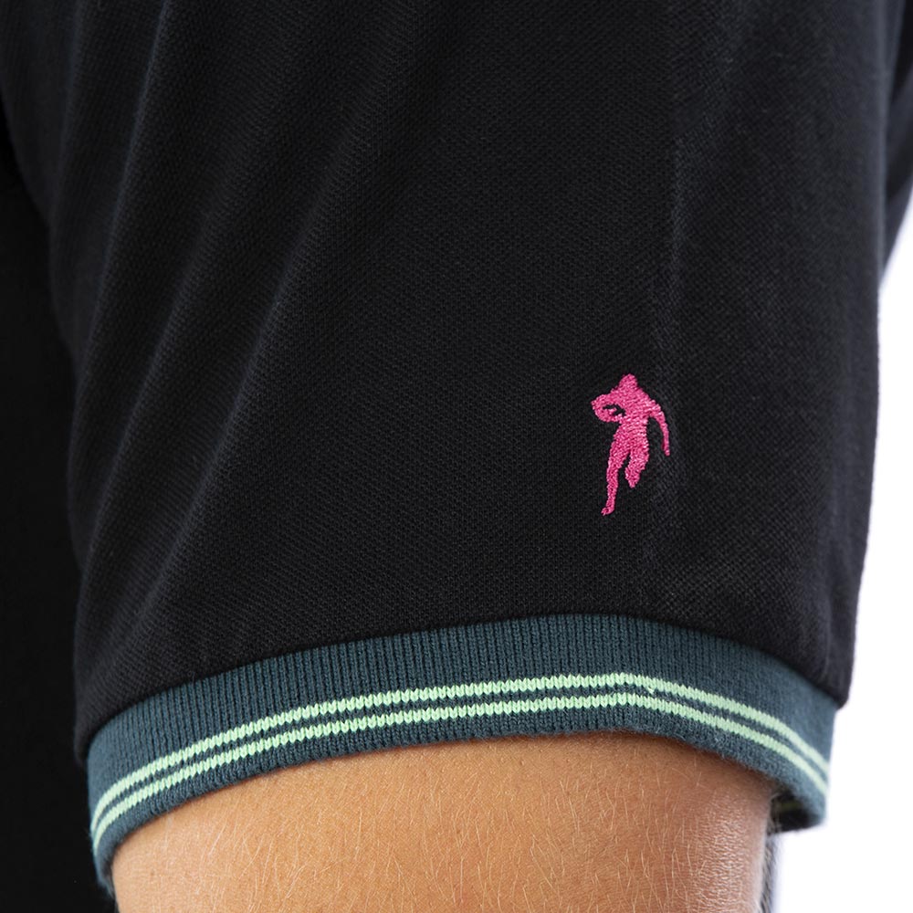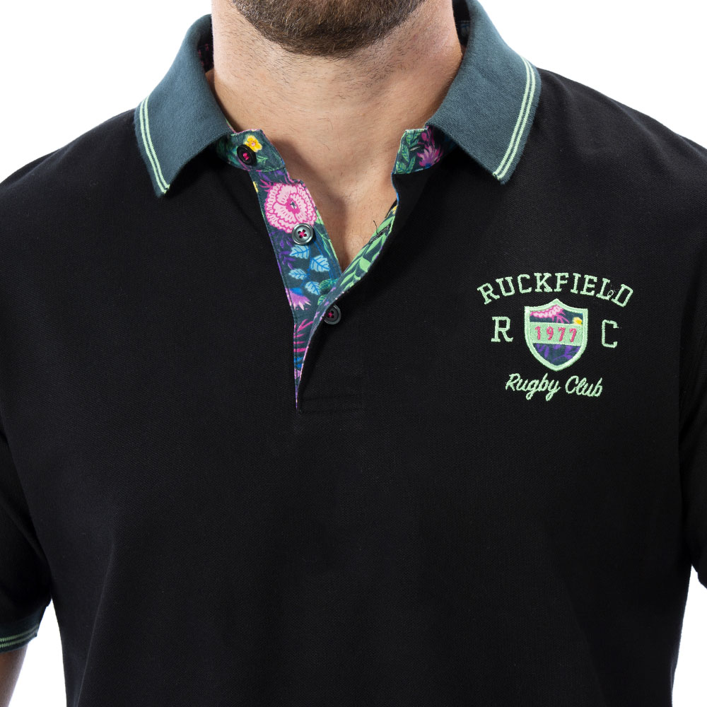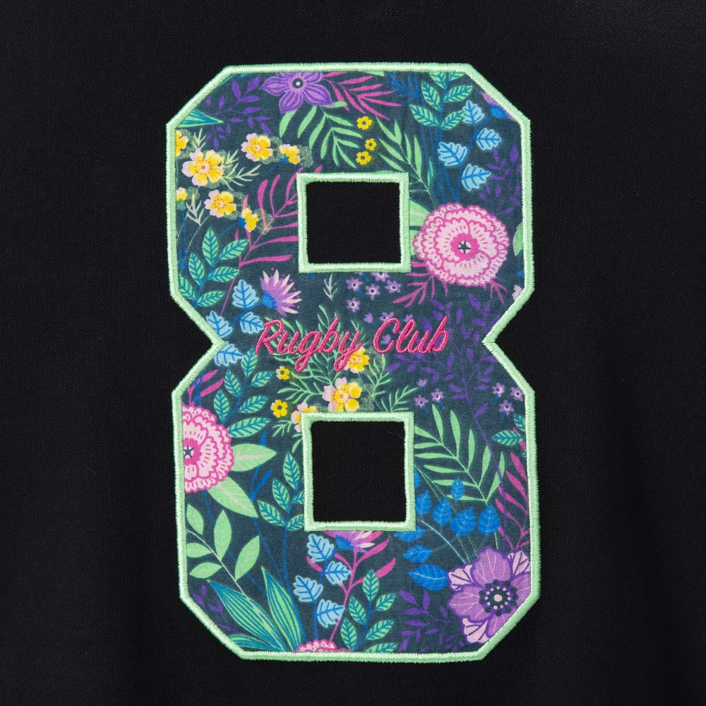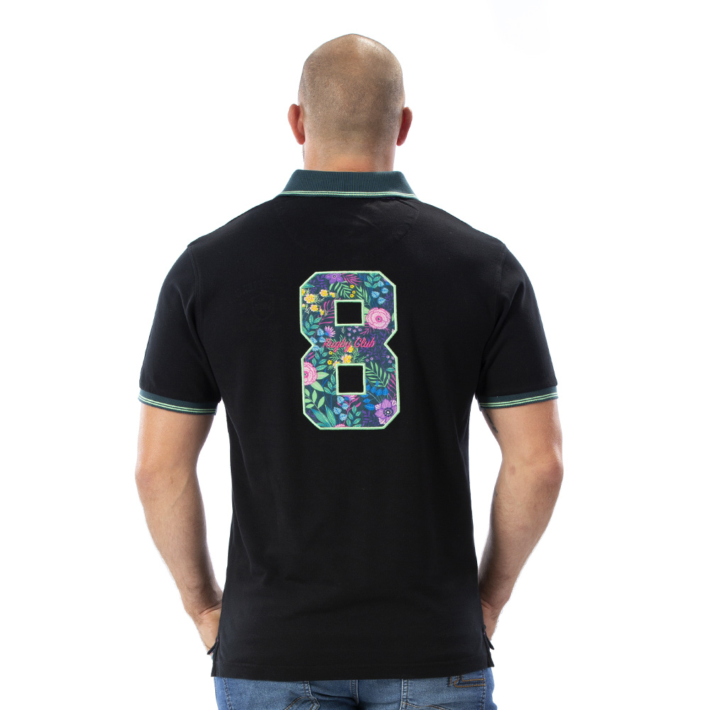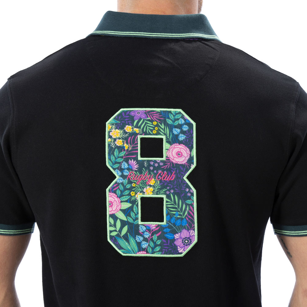 Pour les beaux jours, ce polo noir avec ses broderies fleuries est un incontournable. Pour un style sobre et coloré à la fois, il est très confortable grâce à sa matière 100% coton piqué. Le chiffre 8 est brodé au dos avec des imprimés fleurs. Sur la patte de boutonnage se trouve le même imprimé fleuri identique au chiffre 8.