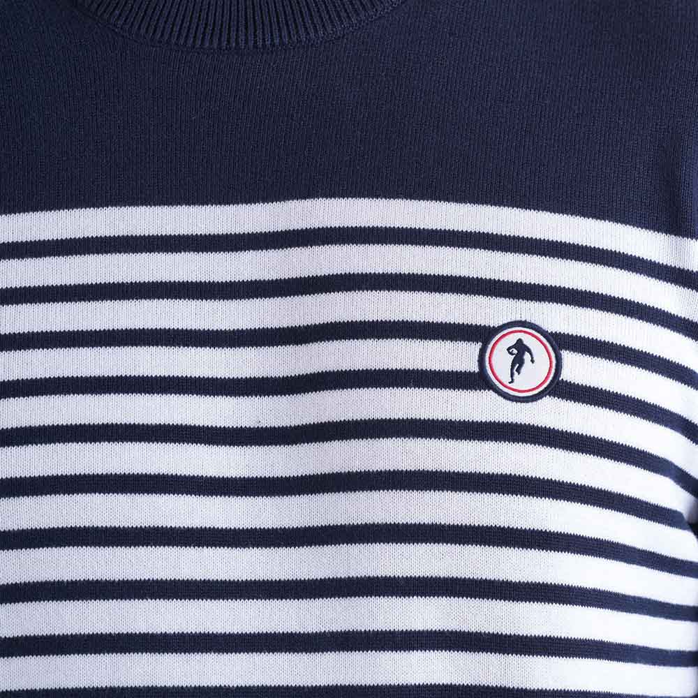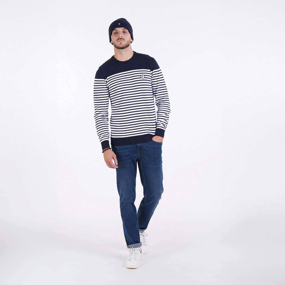Adoptez un look intemporel et raffiné avec ce pull à rayures bleu et blanc. Son design classique aux rayures marines évoque une élégance décontractée, parfaite pour la mi-saison ou les journées fraîches d'été. Fabriqué dans un tissu doux et confortable, ce pull est idéal pour toutes vos sorties, que ce soit pour une promenade en ville ou une journée en bord de mer.