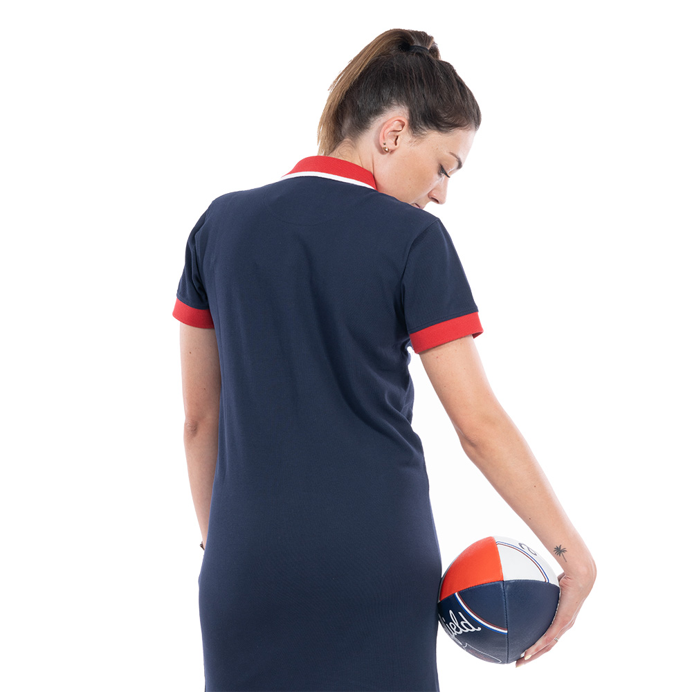 Cette robe-polo classique est revisitée avec une coupe ajustée et des couleurs emblématiques qui lui donnent un esprit sportif.