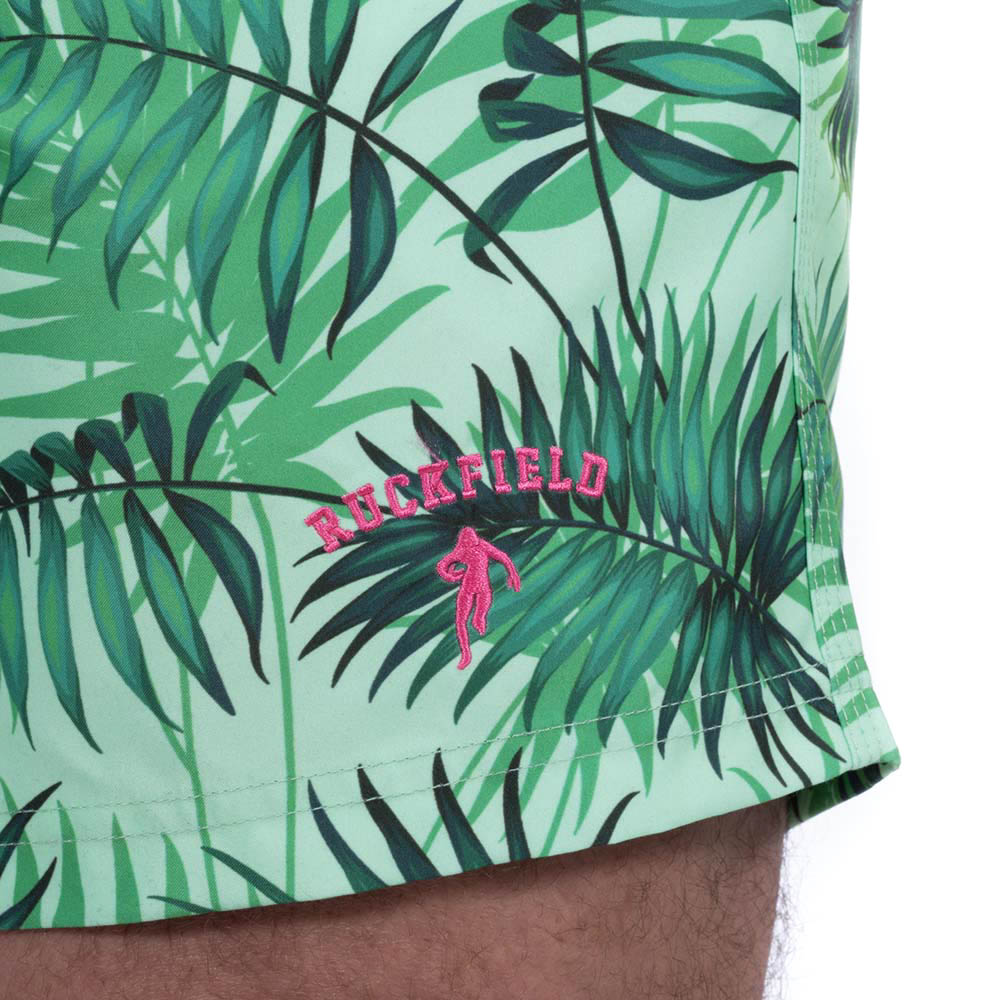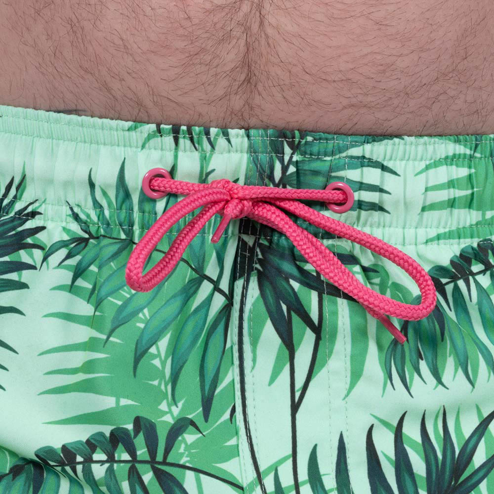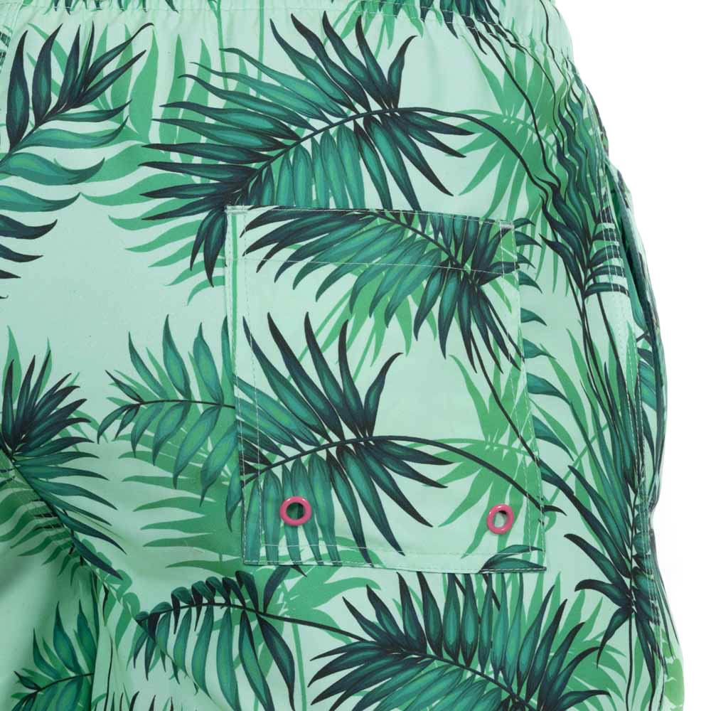 Optez pour ce superbe short de bain vert d'eau du thème Palm beach. On retrouve une broderie Ruckfield sur le bas de la cuisse, un lien de serrage rose, une poche arrière et des motifs feuilles de palmier pour un été fleuri et coloré.