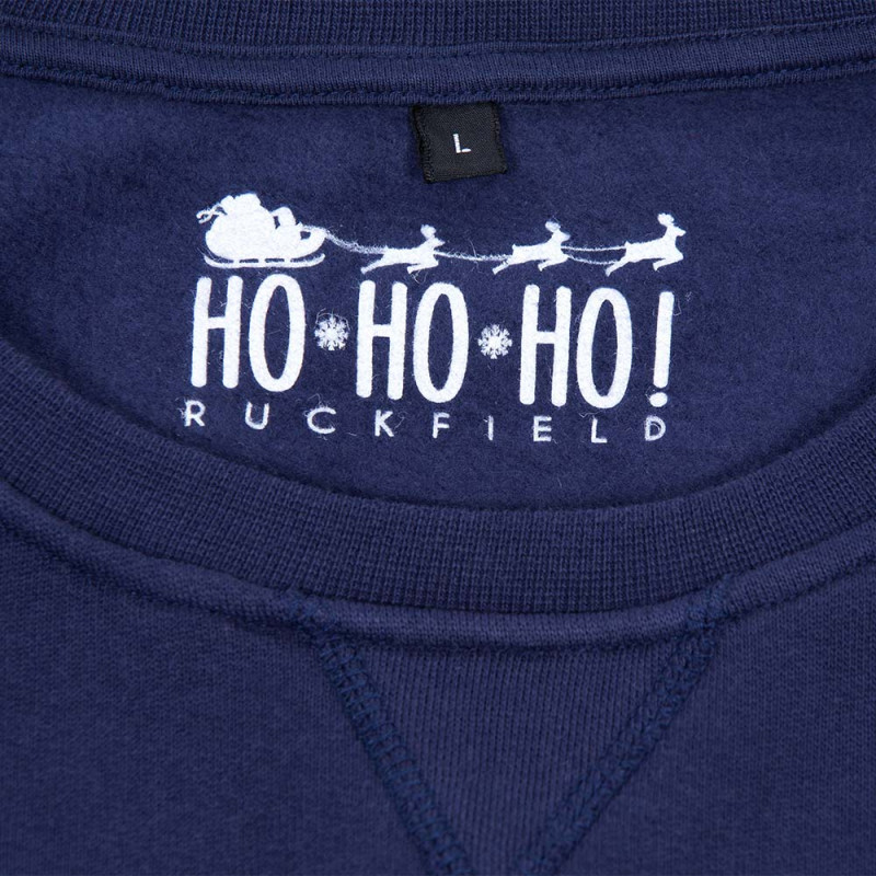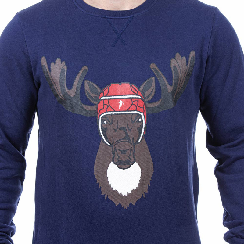Sweat col rond bleu marine sérigraphié d'un cerf de Noël et d'une broderie poitrine. Une pièce originale signée Ruckfield dans sa capsule de Noël.