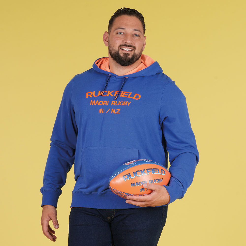 Affichez un look sportif et décontracté avec ce sweat à capuche bleu signé Ruckfield. Conçu en coton doux et confortable, il est doté d’une capuche doublée orange contrastante et d’un cordon de serrage. Sur la poitrine, un imprimé "Ruckfield Maori Rugby IWI / NZ" en orange vif apporte une touche dynamique et identitaire. La poche kangourou pratique permet de garder vos mains au chaud ou d’y glisser vos effets personnels.