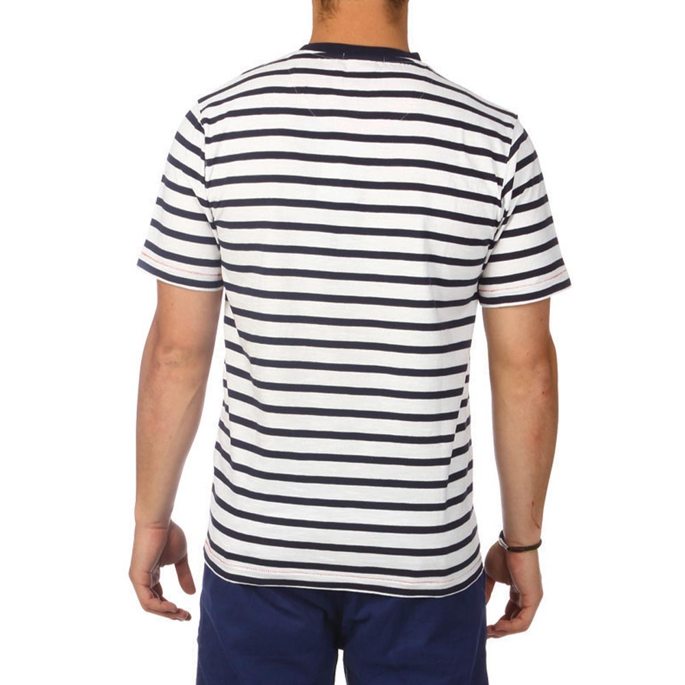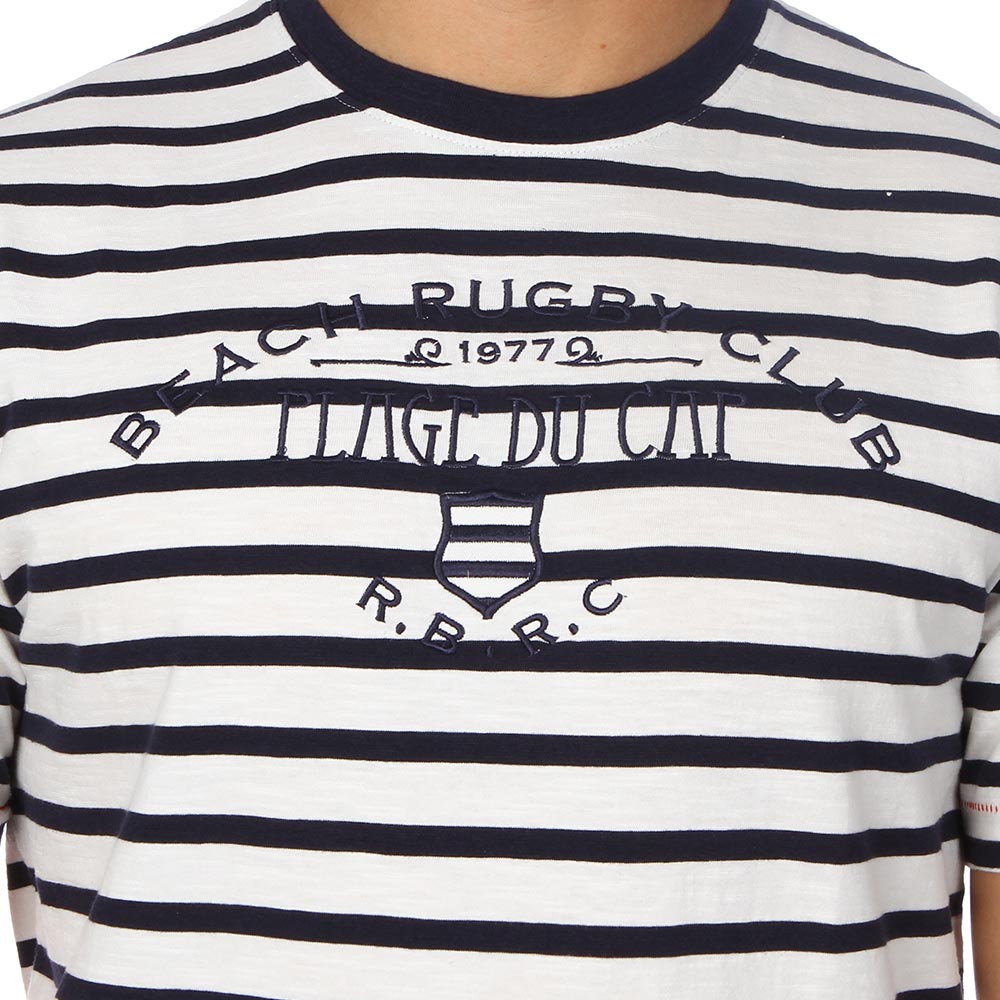 Tee-shirt Ruckfield flammé blanc rayé bleu marine avec broderie représentant la plage du CAP sur le devant du tee-shirt. Ce produit est disponible en grandes tailles jusqu'au 4XL.