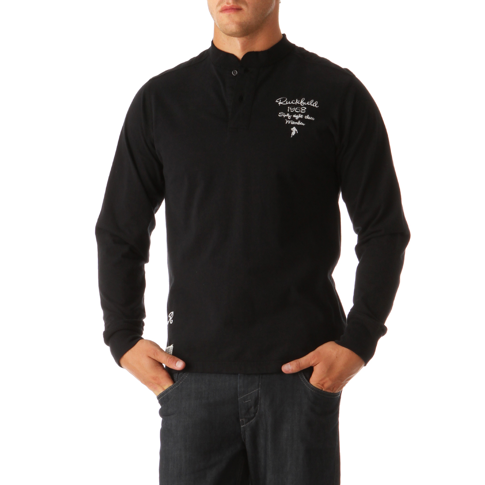 Avec son col tunisien, ce t-shirt noir manches longues en coton jersey est matelassé aux épaules, avec un logo brodé sur la poitrine.