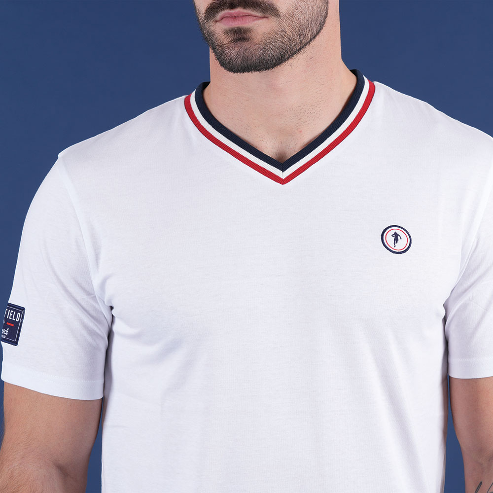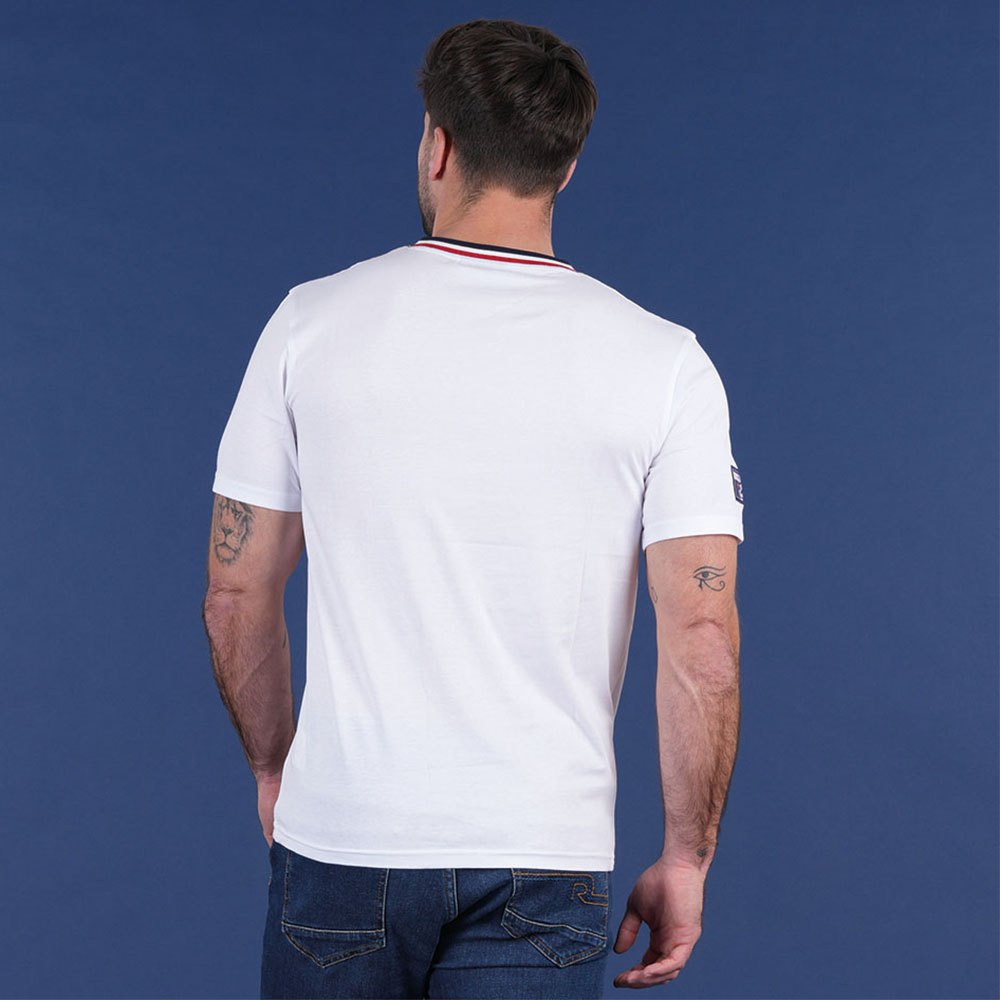 Ce t-shirt blanc à manches courtes allie simplicité et élégance avec son col en V subtilement rehaussé d’un liseré tricolore. Confectionné dans un tissu doux et respirant, il assure un confort optimal.