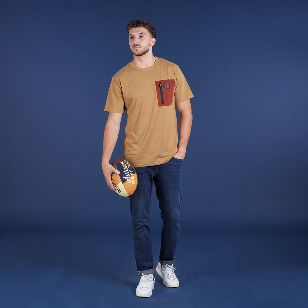Affirmez votre style avec ce t-shirt beige rehaussé d’une poche poitrine contrastée rouille, zippée et ornée d’un patch brodé. Entre esprit outdoor et touche urbaine, c’est la pièce idéale pour un look casual travaillé.