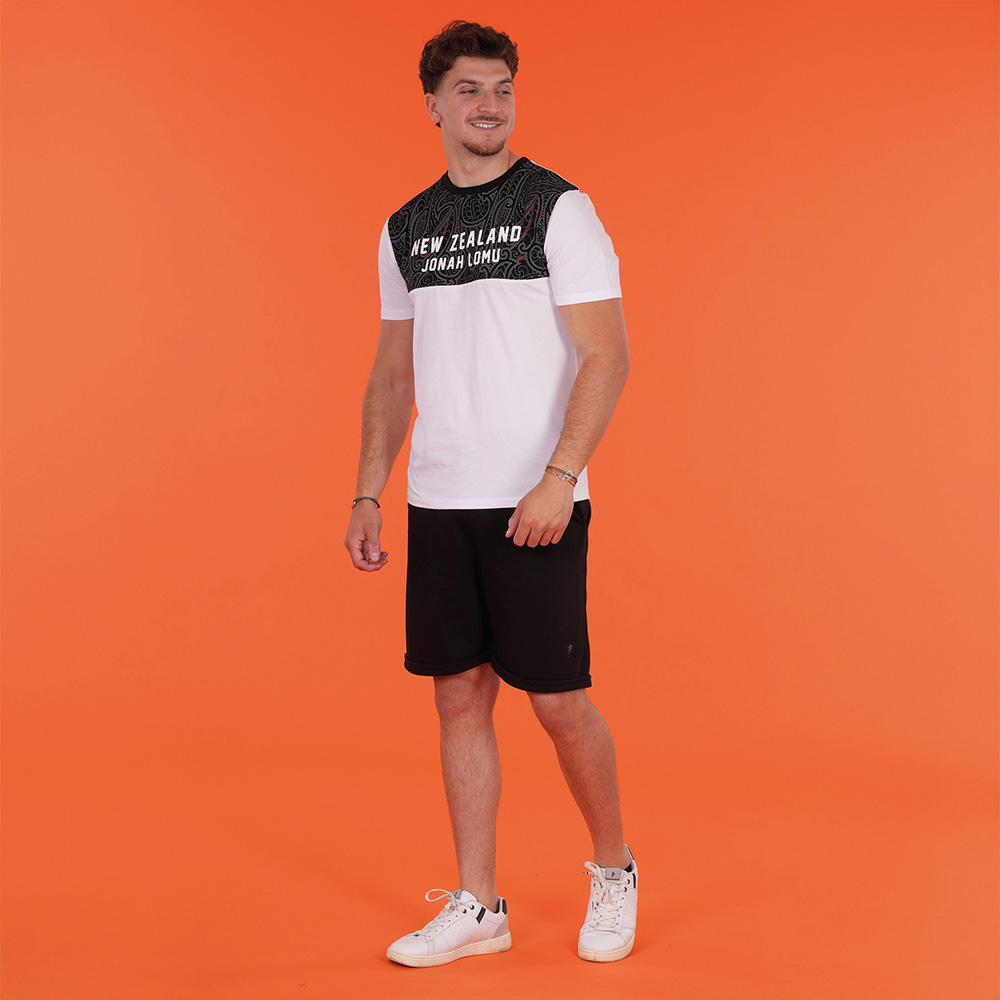 Affichez un style sportif et moderne avec ce t-shirt à l’effigie de la légende du rugby Jonah Lomu. Confectionné en coton doux, il assure confort et respirabilité au quotidien. Son design bicolore met en valeur un empiècement noir à motifs inspirés de la culture néo-zélandaise, avec l’inscription “NEW ZEALAND JONAH LOMU” en blanc contrastant sur la poitrine.